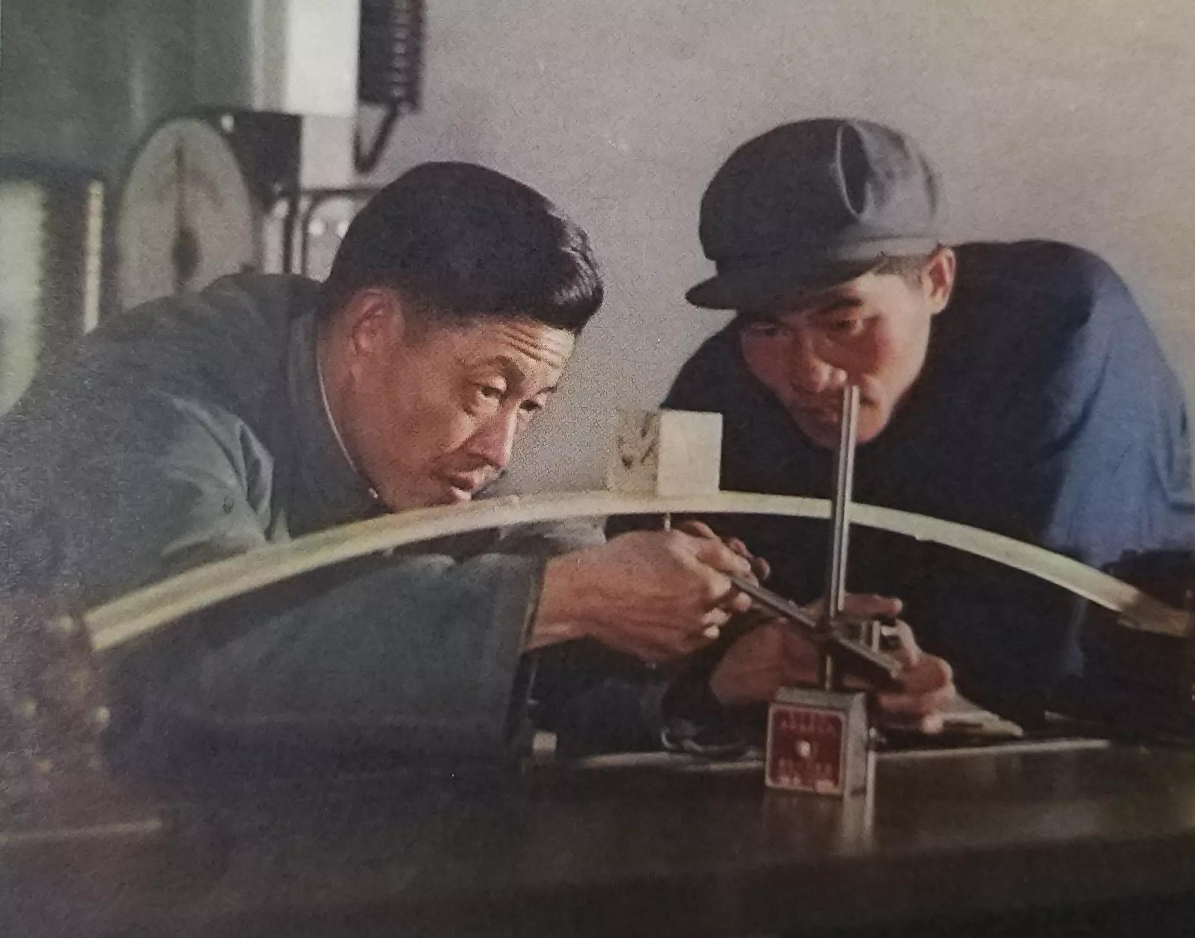 双曲拱桥创始人之一,无锡县交通局桥工队队长苏松源(左)。