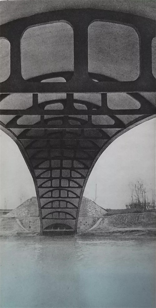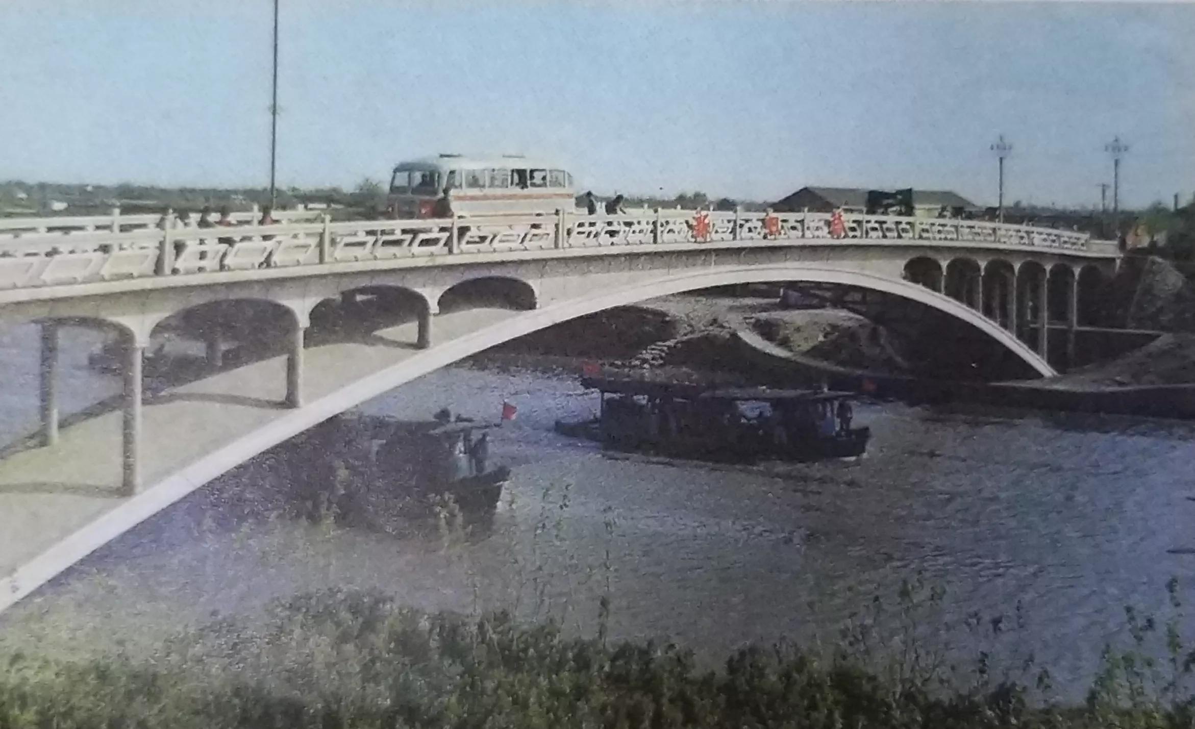 一九六四年无锡县创造的第一座双曲拱桥,跨径九米。