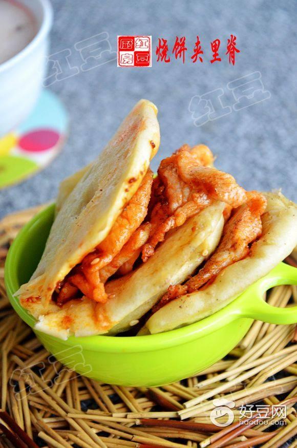 烧饼夹里脊最早出现与街头巷尾的小推车**,烤的香酥软嫩的烧饼,加入煎炸好的里脊肉,上面再刷上甜酱,辣椒,撒上一些孜然粉,那种滋味让你意犹未尽!