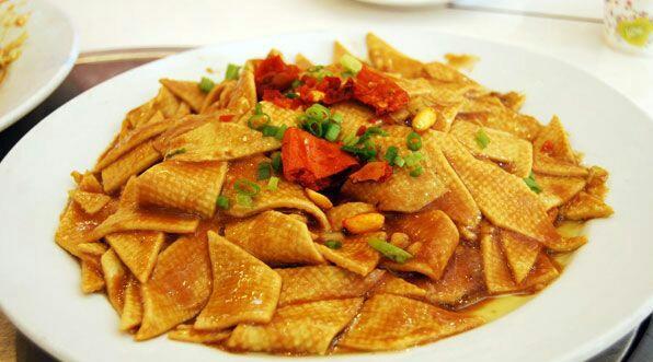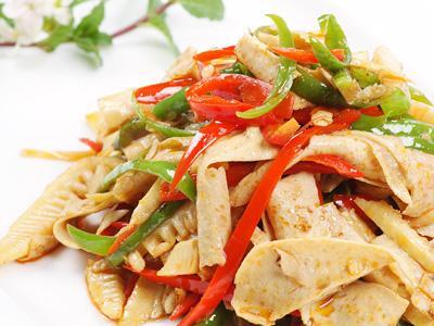 做法:1、干豆腐皮泡软(湿豆腐皮就不用泡了,一般市场都有湿豆腐皮),切成三角形。青红椒洗干净去籽去蒂,切成丝,小葱、大蒜切末。