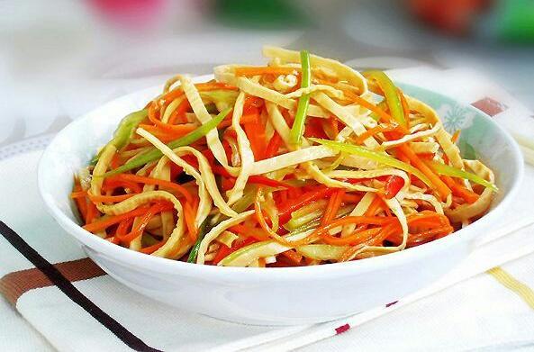 做法:1、豆腐皮切成丝,香菜切成段,香葱切丝,两片胡萝卜切成丝。