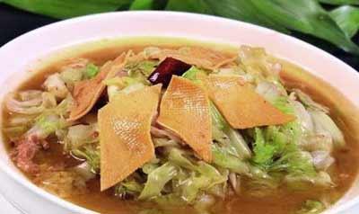 3、下入白菜翻炒,把白菜水分炒出来,变软,然后再下豆腐皮 。下豆腐皮翻炒。最后放入适量的水,加入一点十三香,大火烧开后,转中小火加盖慢炖。