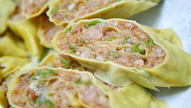 2、取一小张豆腐皮,放上少许调好味的肉馅(馅根据自己喜好调制,饺子馅也可以)像包春卷一样卷起来。卷好扎一根牙签,防止散开。