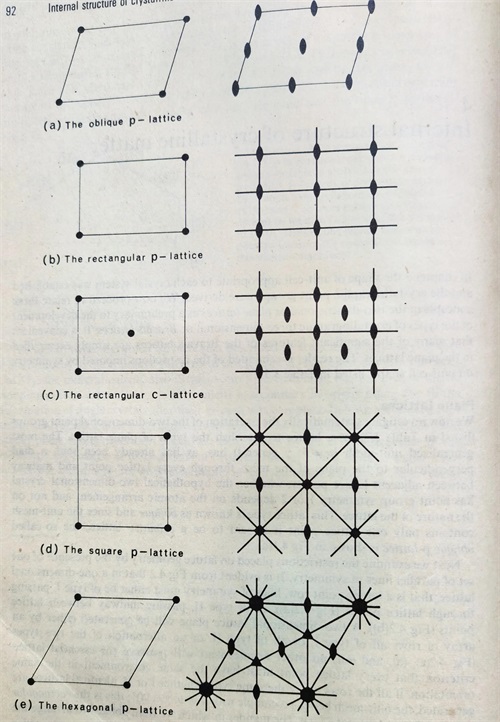 先看二维晶体。观察二维晶体石墨烯的结构。碳原子排成六角形,六角形联成蜂窝状。这是结构,不是晶格。在石墨烯结构中任选一点,可以是碳原子中心,可以是碳一碳连线中点,可以是碳环的中心。值得注意的是,完全可以不选这类特定点,而是选没有对称性的任意点。选定后可以在结构中找到与该点环境完全等同的点(原子种类,方位,远近)。把这些排列的点抽出来看,就是这一结构的周期性,是二维点阵,可以连线成二维晶格,从对称性观点看是二维平移群。三者本质是一个“东西”。只昰从不同角度描述周期性。二维结构周期性有5种。过去学习和应用比较少见,现在二维晶体已进入材料研究和应用前沿。这里给出从英文版【结晶固体】一书中搬来的二维晶格及对称要素排布图。见图。