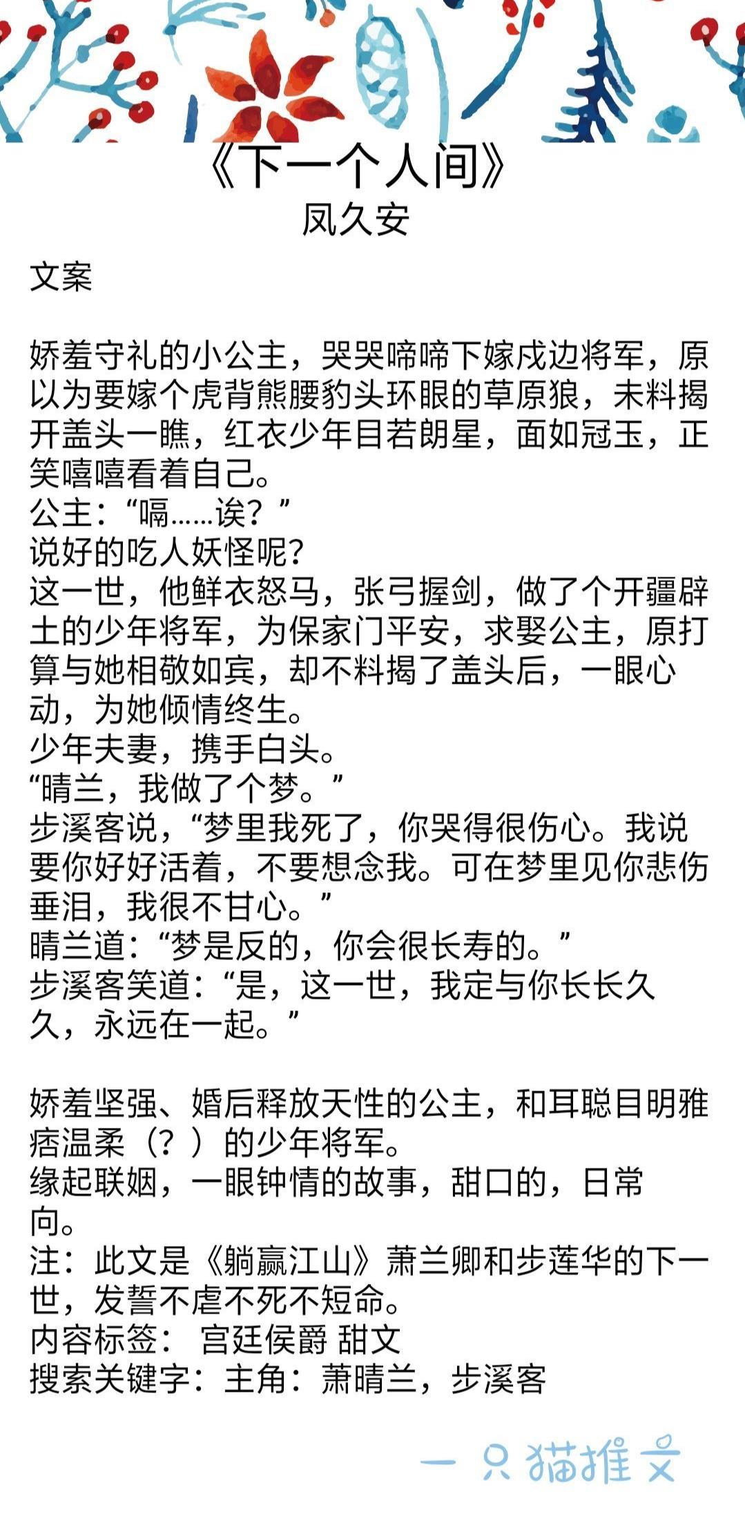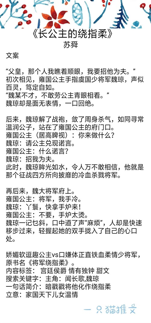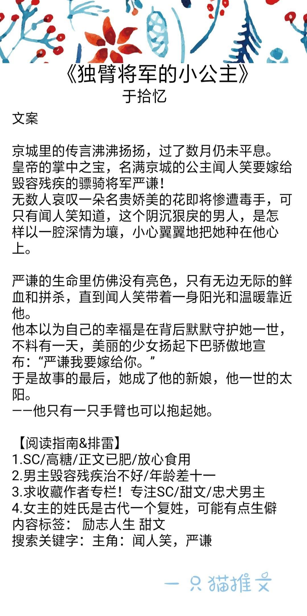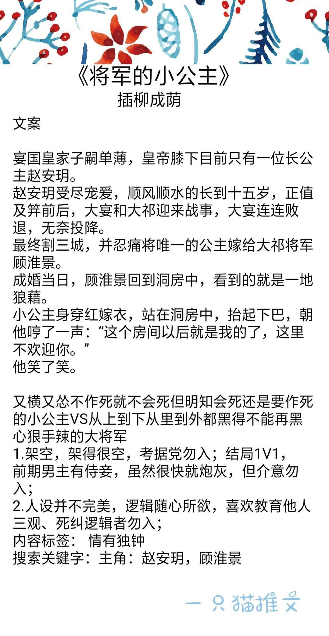 男主是临国大将军,女主还是一个小公主的时候,为了躲避一波又一波的相亲对象。随手当众指名喜欢男主那样的大将军,被男主当场拒绝哈哈哈,但女主也没有很难过,她只是为了躲避相亲。两人再次见面就是很多年以后,男主有难女主相救。文笔剧情都可,就60几章也不长,挺好看的,安利给大家。