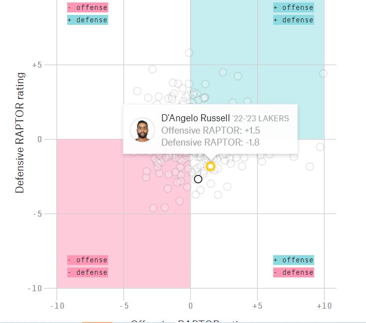 通过这张定位图,我们可以很清晰地看到,RAPTOR认为,丹吉洛拉塞尔无论在攻防两端,都是比威少更好的球员——而放在全联盟中,拉塞尔的进攻超出平均水准不少,而防守则低于平均水准不少。