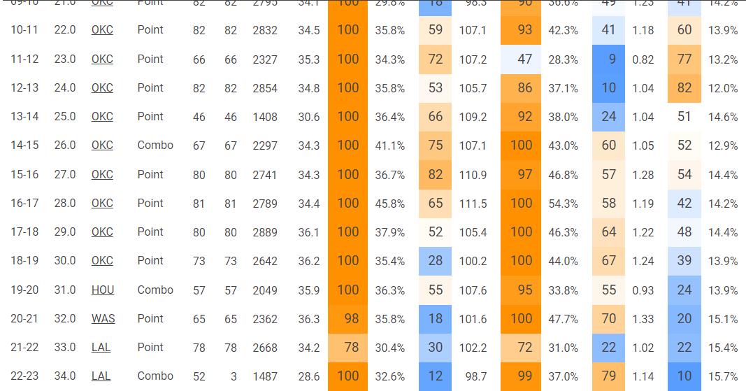 在过去的三年里,拉塞尔一项显著的变化是他的使用率逐步降低——从开始的31%,降低到了25%。