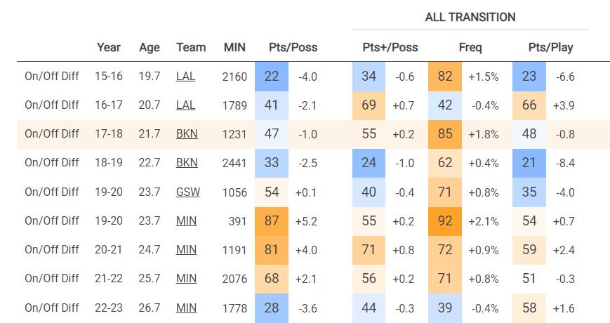 可以看到,这两张图反应的东西与上面那张总体ON/OFF的图反应的基本是一样的——在过去三年,拉塞尔作为主控,无论是半场进攻还是转换进攻都调动得很不错,尤其是半场进攻。当他在场时球队的提升相当明显。