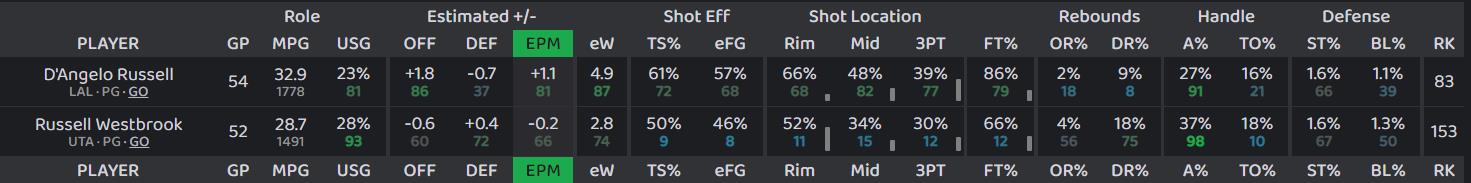 丹吉洛-拉塞尔的EPM,在本赛季所有控卫里排第19名——他基本是联盟明星控卫与合格首发之间的分水岭,符合我们此前对他“明星后卫末位”的印象——而拉塞尔-威斯布鲁克,EPM在本赛季所有控卫里排第31名。