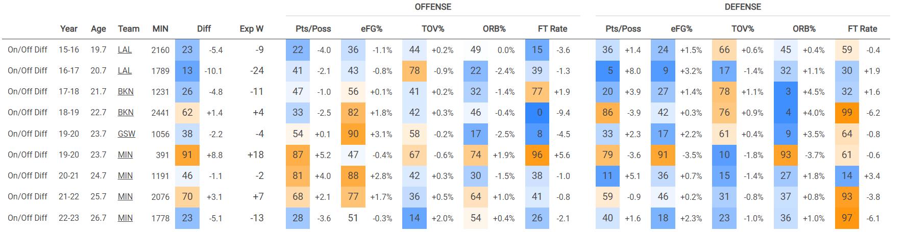 我们可以看到,在过去三年里,拉塞尔的进攻端on/off数据都是相当不错的(超过联盟68-87%球员)——但本赛季,他的进攻端on/off数据变为了负值(仅超过28%)。