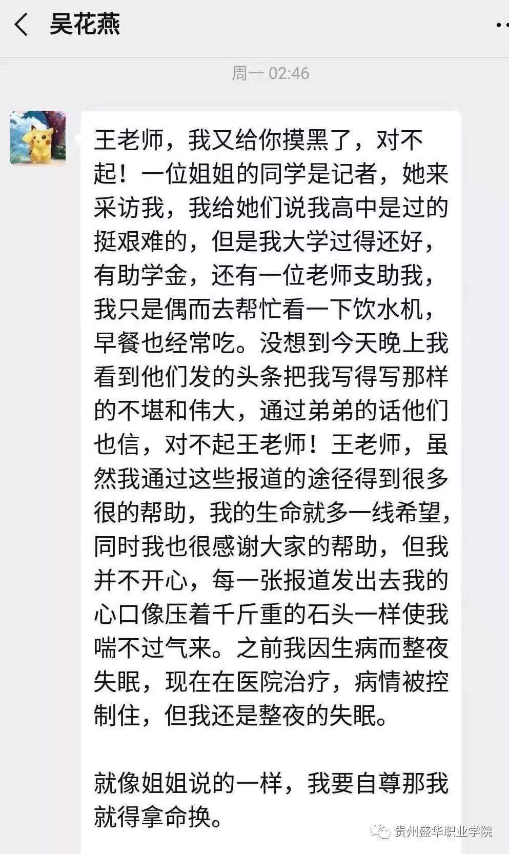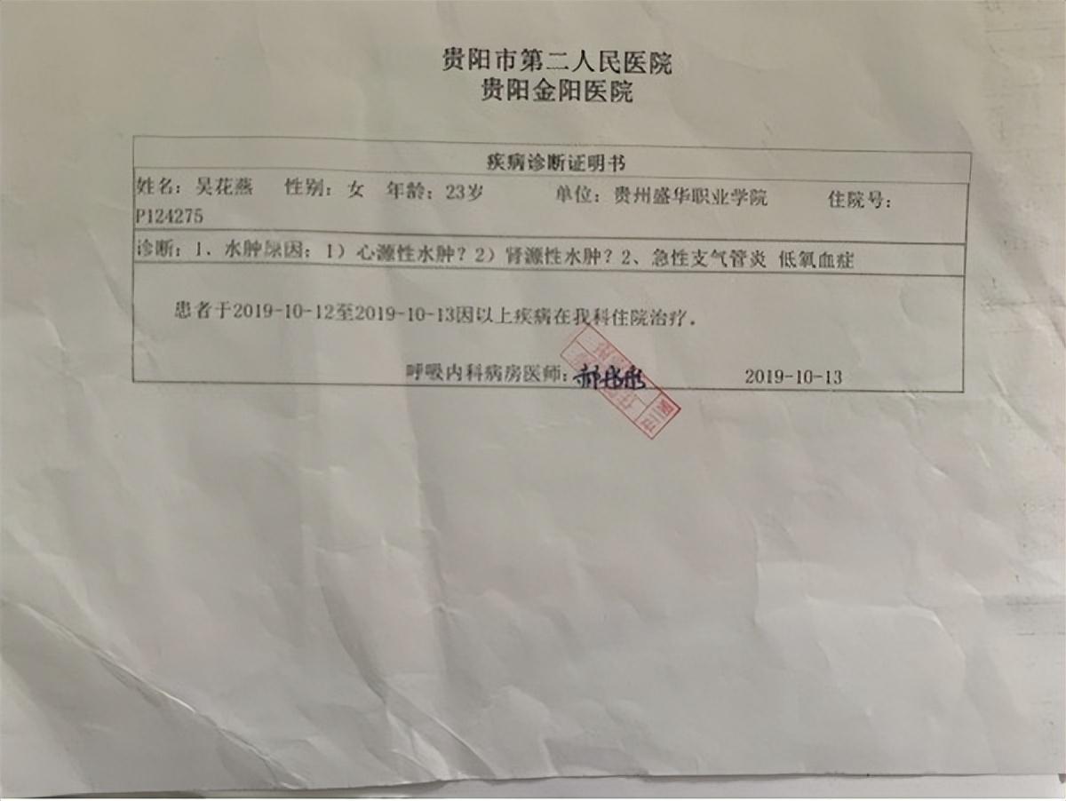 2019年9月29日,高中同学石荣丽去贵州盛华职业学院看望吴花燕,却意外发现吴花燕的脸色十分苍白,仅40米长的路正常人很快就走完了,吴花燕却走得特别艰难,中间还得休息一次。