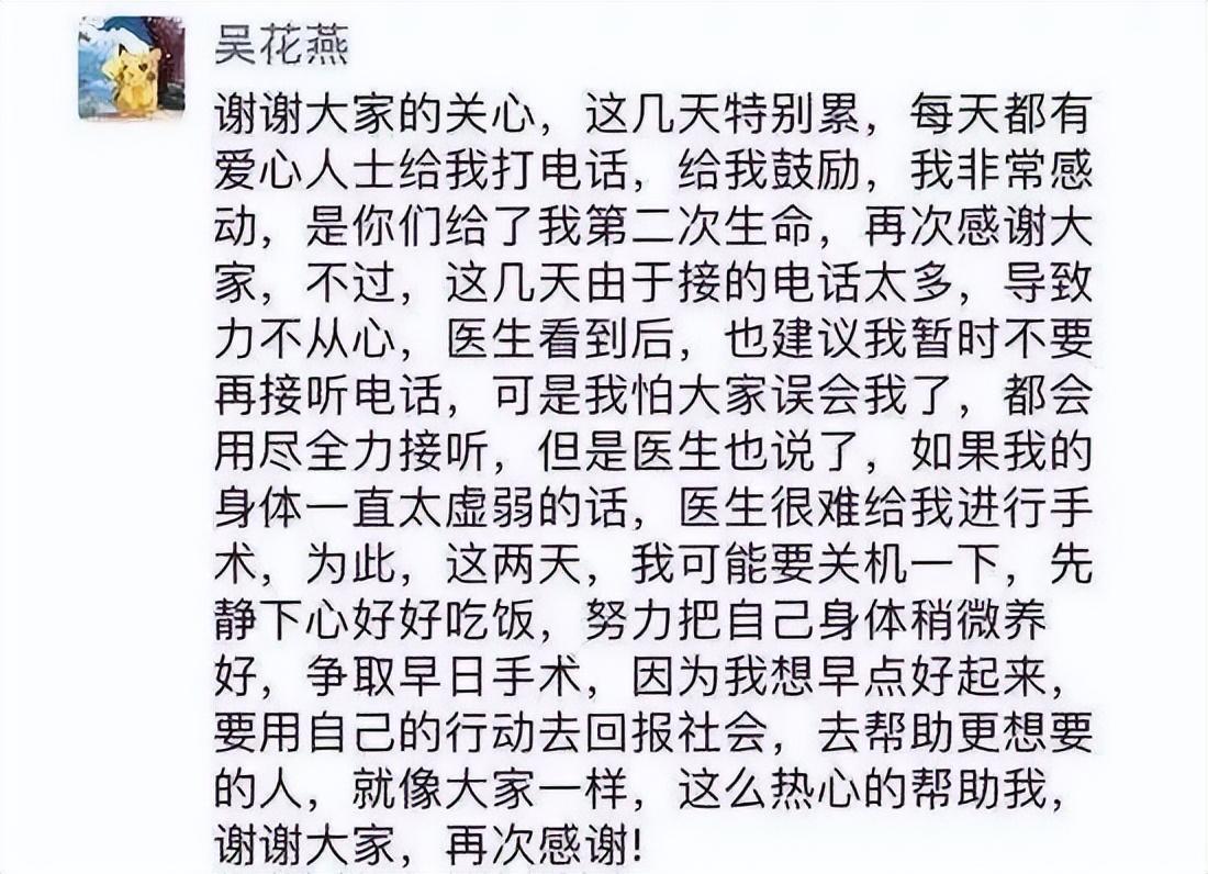 尽管吴花燕始终被媒体折磨着,但对大家心怀感恩的她,顶着虚弱的身体,也要接起每个前来关心的问候,尽力地解释媒体所夸大渲染的“热点”究竟是什么样。