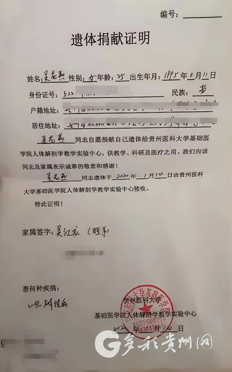 她的遗体最终捐献给贵州医科大学基础医学院人体解剖学教学实验中心,供教学、科研及医疗之用。“姐姐走得很安祥,按照姐姐的生前遗愿,我们已将她遗体捐献给贵州医科大学基础医学院人体解剖学教学实验中心,供教学、科研及医疗之用”,1月14日15时在遗体捐献仪式上吴江龙流着泪说,姐姐生前多次说过,虽然家庭不幸,但有各级党委政府和社会各界的帮助,她很温暖。