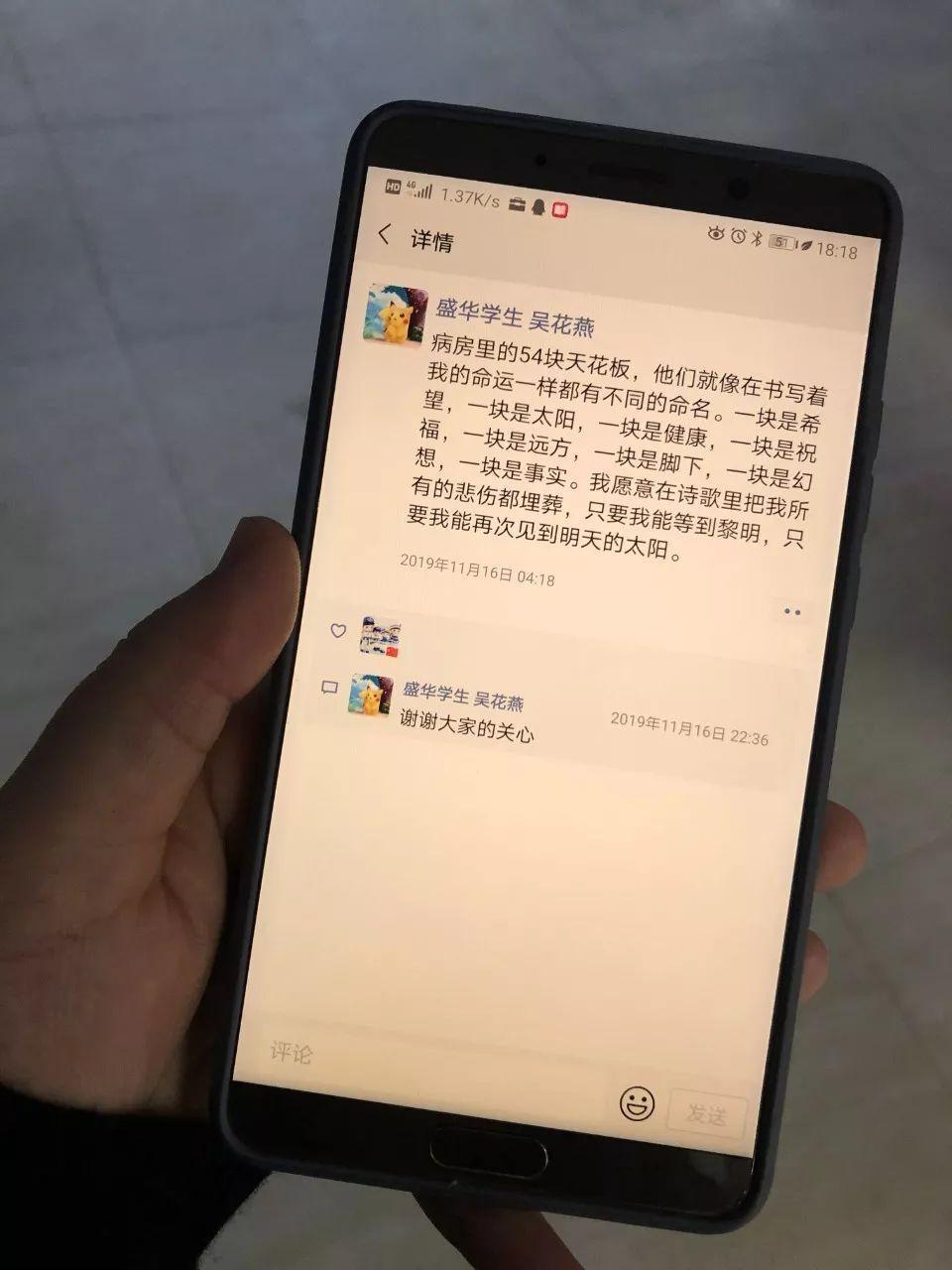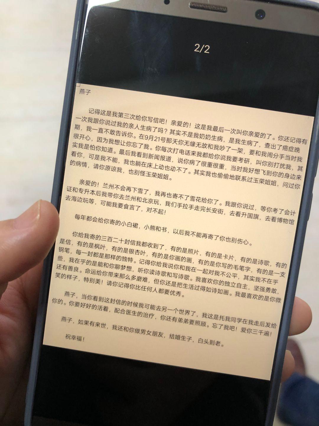 2019年12月初,吴花燕收到男孩写来的“最后一封信”。收到这封信的次日,12月3日晚,吴花燕发了一条朋友圈:从病床上爬到窗户边,看着熙熙攘攘的人群,多么想他们来告诉我兰州还会再下雪,我等的人还会再回来。