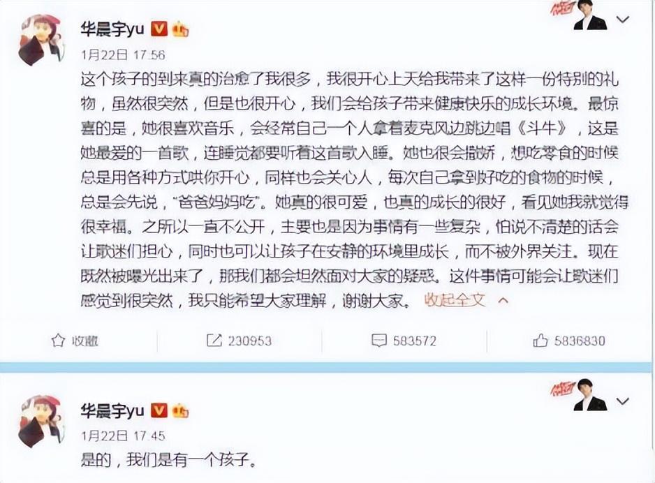 “是的,我们是有一个孩子”,华晨宇突然发布这么一篇的微博,就在网友摸不着头脑,一脸懵的时候,张碧晨随后发出的一篇微博更是一石激起千层浪,让网友直呼不敢相信。