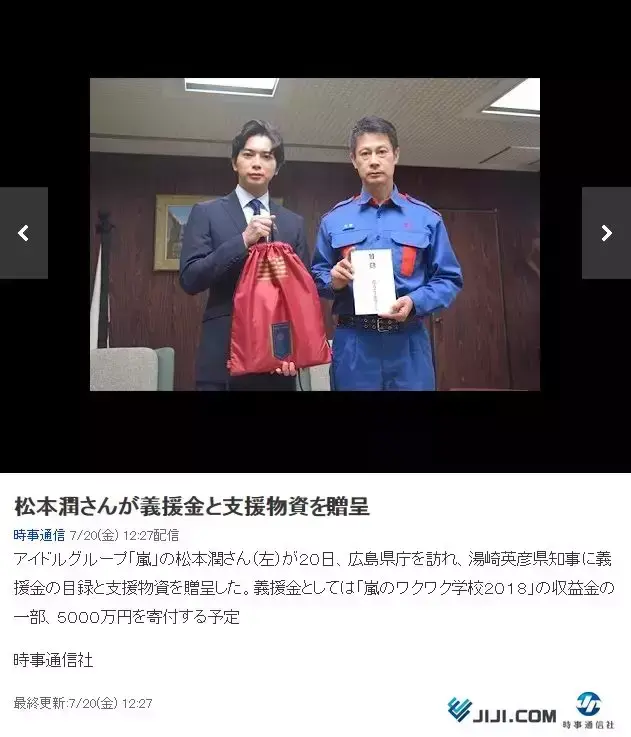 上个月日本广岛遭遇暴雨灾害,松本润代表岚前往广岛为灾区捐赠5000万日元,帮助受暴雨灾害地区的重建。他表示“希望我们能成为大家的力量,也希望大家能够尽快的恢复笑容回到充满元气的生活中。”展现了国民偶像的亲和力,以及用自己的影响力让更多人去关注灾区。