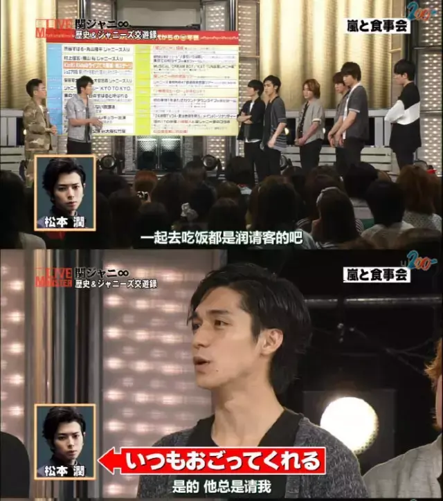 这样的亲和力,也展现在对杰尼斯后辈上。关八的锦户亮就透露过,2008年时自己和岚的二宫和也首次共演,松本润担心到自己和二宫不熟,所以安排好,约上自己和二宫一起吃饭,介绍两人认识。当然,每次一起吃饭都是松润付的钱,这样的前辈请给部屋君来一打好吗!