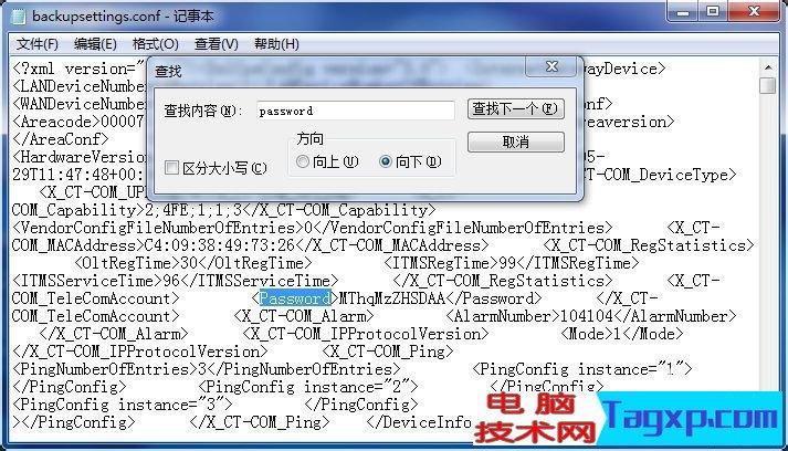 2,登录后在浏览器输入192.168.1.1/backupsettings.conf,下载backupsettings.conf这个文件,用记事本打开,查找“password”得到密码串: