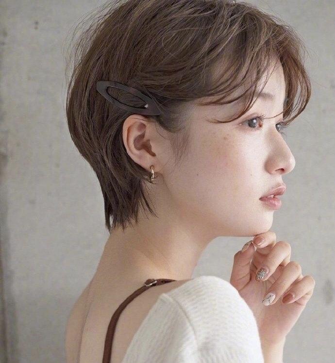 如果担心黑直发的超短发太过古板,气质太man,那么不妨尝试一袭这种微卷的超短发。在发梢处做出蓬松的卷度,整个人的气质也更加甜美。像这位小姐姐一样,即便脸颊处还有星星点点的色斑,也不影响她整体的气质之美。尤其是选择一个浅棕色的发色,会显得你气质更加温和,肤色也更加白色。给人一种清爽简约的畅快质感,初春的季节,你会给自己换上新鲜的发型吗?