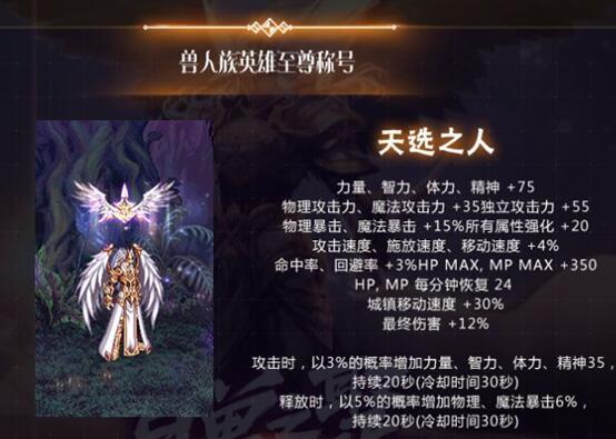 天选之人这个称号绝对是神豪才配拥有,这个称号不仅属性好造型炫酷而且是实实在在的吸引目光的存在,天选之人的获得方法也没有那么的繁琐,总之一句话能够解决,购买2018春节套10套赠送“兽人族至尊称号礼盒”,打开礼盒即可获得天选之人称号。而且天选之人属于隐藏称号,当时看到有人站街的时候使用这个称号是真的觉得太炫酷了,我记得当时自己的一个小伙伴咬咬牙获得了这个称号之后,我们所有人就都找他借号玩,不为别的,就只是为了体验一下这个称号的快感!