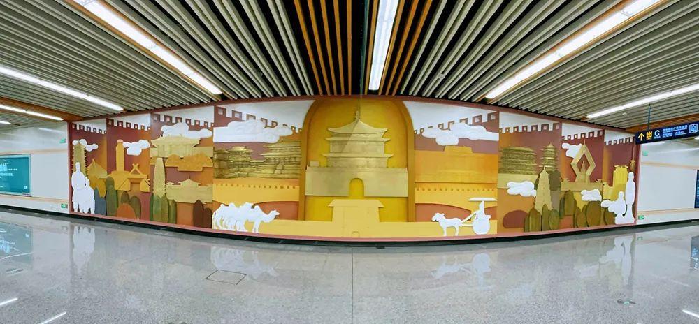 从C口步入站厅层,以古建筑“藻井”为元素设计而成的吊顶映入眼帘,车站装饰采用唐代屋檐造型,整体以土黄色为主调,在柱面与墙面随处可见祥云与西安城墙元素的纹样,融合了古今建筑与本土特色的文化背景墙等,每一处细节都让这座位于明城墙与大明宫国家遗址公园之间的地铁车站,古韵今风相得益彰,焕发出别样的魅力。
