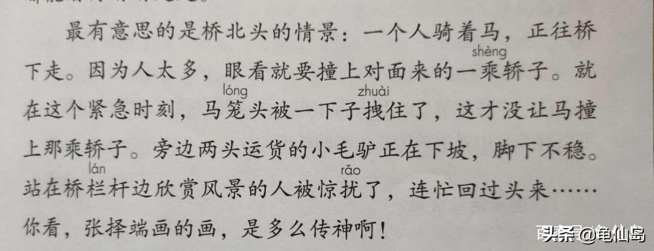 最有意思的是桥北头的情景:一个人骑着马,正往桥下走。因为人太多,眼看就要碰上对面来的一乘轿子。就在这个紧急时刻,那个骑马人一下字拽住了马笼头,这才没碰上那乘轿子。不过,这么一来,倒把马右边的两头小毛驴吓得又踢又跳。站在桥栏杆边欣赏风景的人,被小毛驴惊扰了,连忙回过头来赶小毛驴……你看,张择端画的画,是多么传神啊!