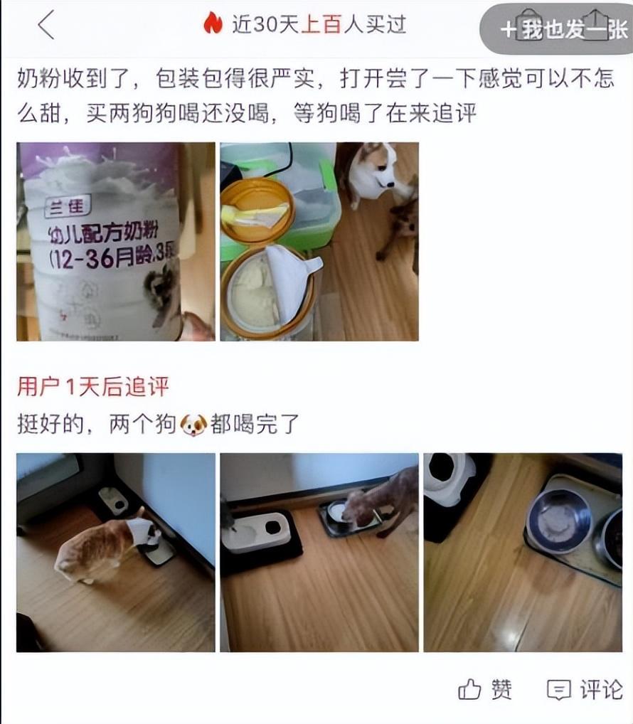 但另一个人也晒图了,他却是将同样的产品买回家给狗子喝: