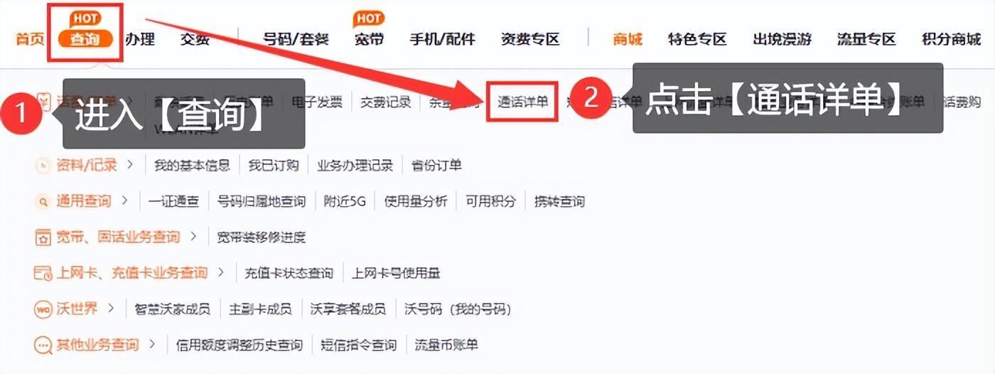 步骤2:在网页首页的导航栏中将鼠标移动至【查询】处,然后在弹出页面中选择【通话详单】。