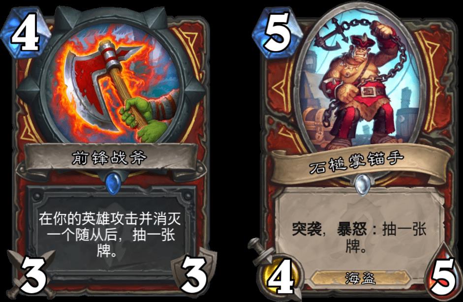 前锋战斧的作用和石槌掌锚手差不多,都是过牌。我个人认为它的费用比较高,但也有相当一部分玩家觉得它非常好用,配合突袭随从过3张牌能大大提高突袭战的操作空间,也能让体格训练发挥更强的效果。