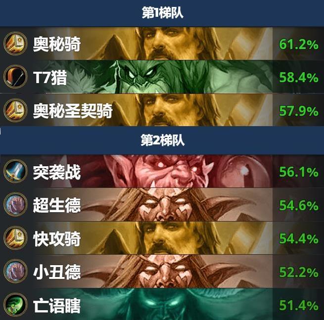 自从补丁上线,我有一段时间没关注天梯动态了。本以为标准天梯环境会一直保持骑士、猎人二虎相争的局面,没想到突袭战异军突起,把战士的整体胜率一路从第七名带到了第三名,直逼骑士和猎人。