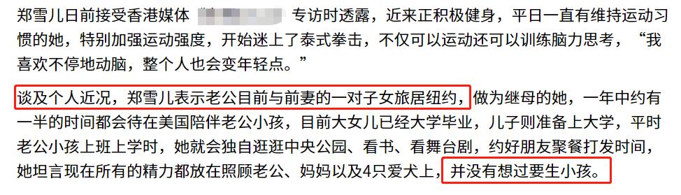 嫁入豪门10年,郑雪儿一直没有生娃,现在和未来她也不打算生娃。原来,他老公与前妻育有一子一女。虽说不是自己亲生的,但郑雪儿视继子继女如己出,一家人关系一直很融洽。