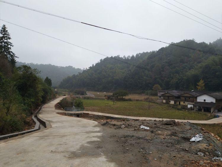 清晨的山间弥漫着浓重的雾气,乡道一旁种植着桃树,为这即将进入隆冬的季节增添了一份新意