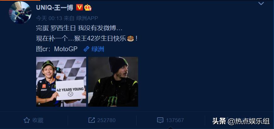 17号零点13分,王一博发文为偶像罗西庆生,“完蛋 罗西生日 我没有发微博…现在补一个…猴王42岁生日快乐”引起热议,目前点赞人数以百万为单位。