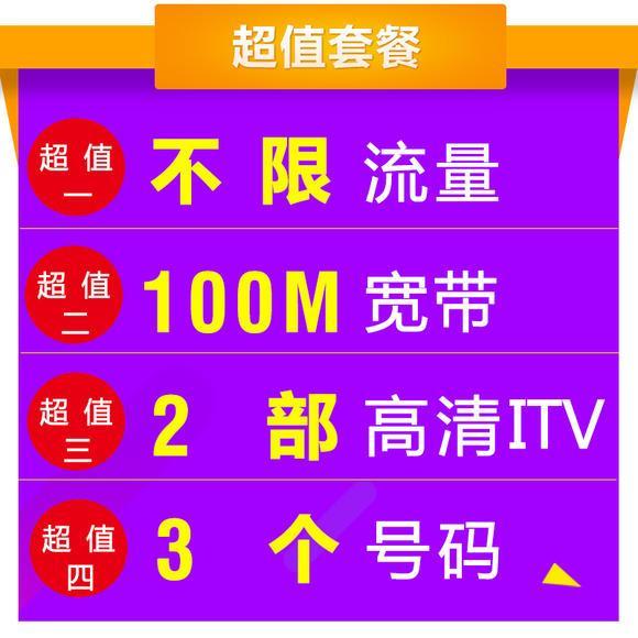 套餐内容:100M宽带+3张不限流量手机号码卡一张+2部高清ITV机顶盒