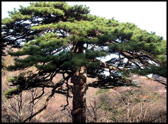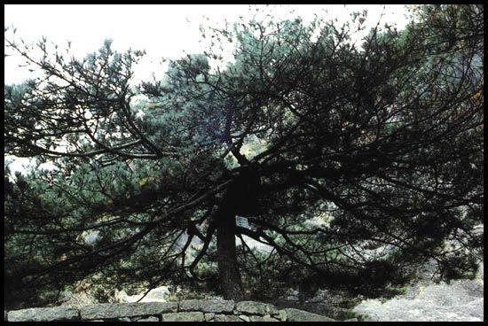 立于卧云峰陡腰,地处海拔1670米,树高仅3.5米,侧枝倾伸前海,犹如苍龙探海,戏搅浮云。树龄约500年。