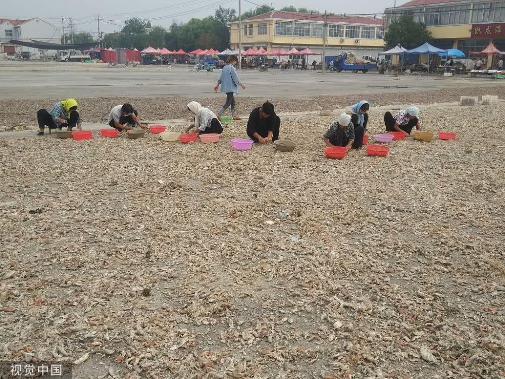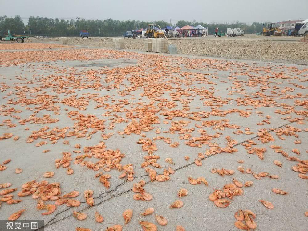 渤海湾畔海产丰收,成群鱼虾分拣后当街晾晒,场面赛晒粮食