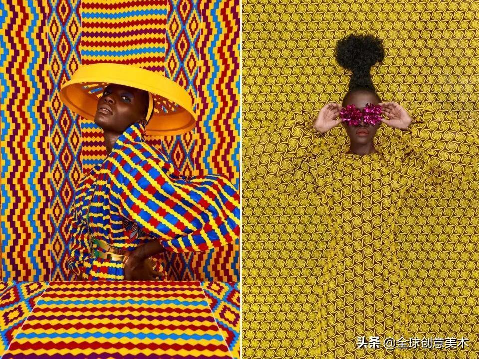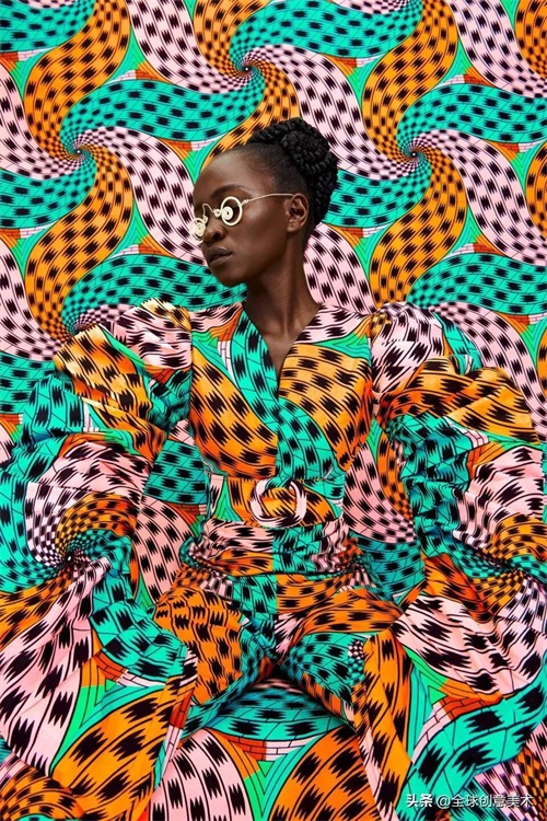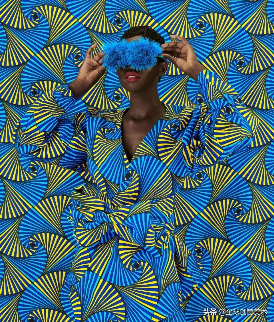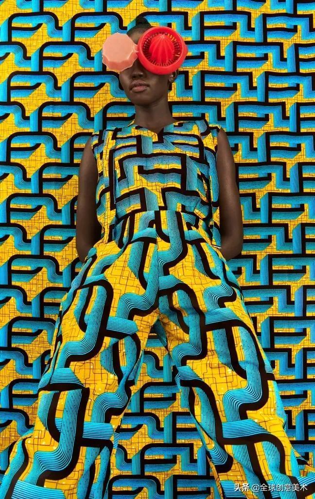 一开始,她只是对印有生动活泼的几何图案和眩目图案的面料的简单欣赏,现在已经演变成对非洲肯尼亚纺织文化的大狂欢。她从市场上采购面料时,特意挑选代表肯尼亚热辣辣风格的、让人眼花缭乱,但又不那么传统老旧的部分。模特们穿着耀眼的时装,在同款布料搭起的拍摄背景前摆出各种姿势,视觉上我们仿佛只能看到模特的脸和手,模特的身体在背景中隐匿了起来。