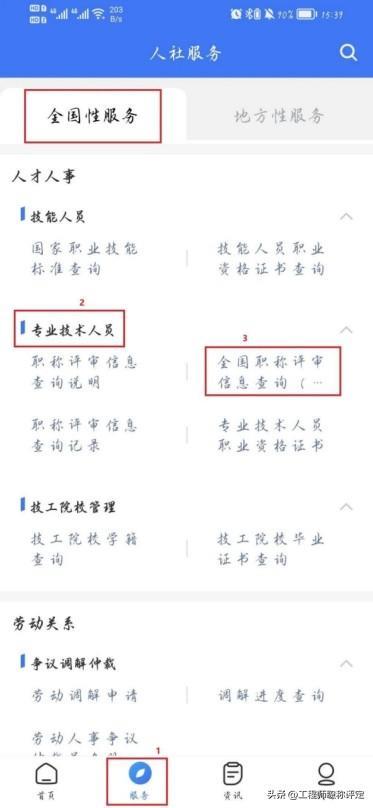 手机下载“掌上12333”APP,登录APP,进入“服务”界面,“全国性服务”下拉,找到“人事人才”,在“专业技术人员”框中,选中“全国职称评审信息查询(试运行)”,具体操作如下图所示: