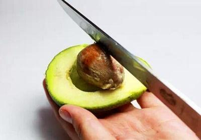 3.用刀切入牛油果的果核一点点,左右轻微摇摆,将果核一起提起。
