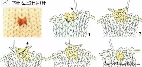 【第2行】线放在针的上面,将第1针上针挑下不织,挑下后,直接织下针2针并1针,再将线从针尖处绕到针的上面,织下一组2针并1针,一直到最后。( 2针并1针,即减掉1针,绕线,即加了1针,如此才保持针数不变 )