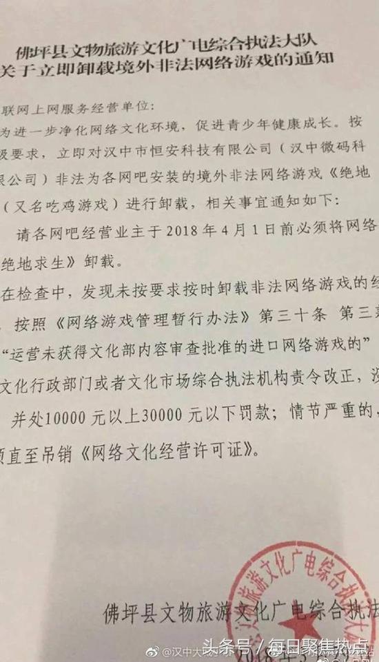 网传,汉中文化执法部门要求所有网吧下架此游戏,并称对未取得网游许可证,拒不卸载的网吧进行罚款处罚。