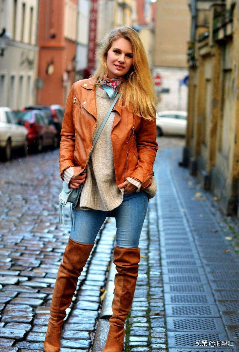 这种搭配方式属于那种时髦显气质的类型,咖啡色皮衣帅气迷人,里面配浅色毛衣很合适,下半身是牛仔裤和过膝长靴的搭配方式,也是很经典的,保暖效果好又能显腿长,整体来说吸晴效果非常不错,优雅又性感。