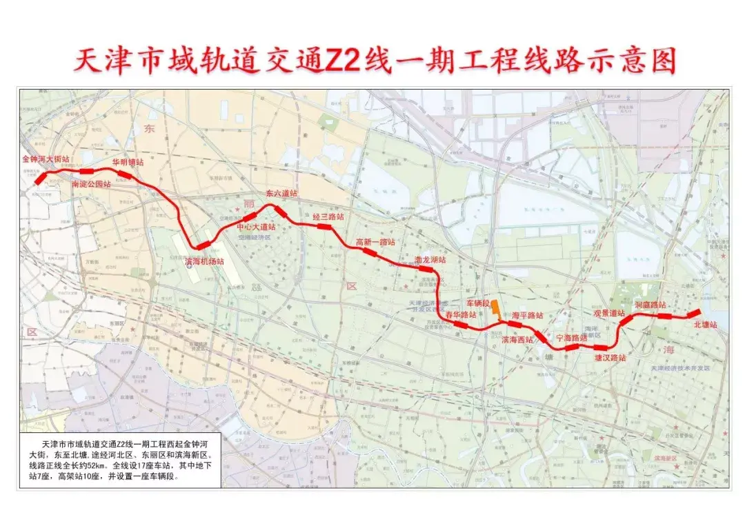 Z2线一期工程于2020年开始动工,西起金钟河大街,东至北塘,途经河北区、东丽区和滨海新区。具有中心城区与滨海新区间市域快线和中心城区与外围组团连接线的功能。