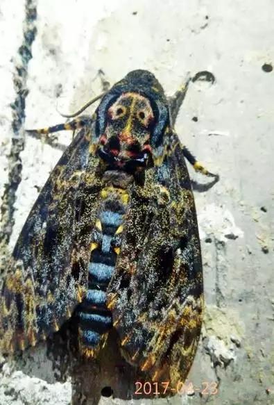 鬼脸天蛾,又名人面天蛾。它背部的图案像张脸,而且像传说中的鬼脸,所以鬼脸天蛾的名字因此而生。夜晚会趋光,白天停栖与翅色近似的树干上。