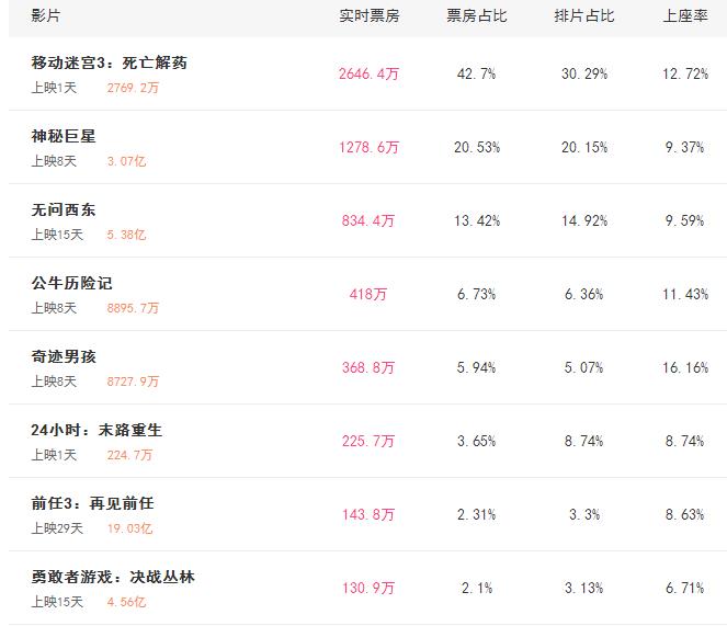 实时票房:《移动迷宫》压倒性第一,有一部电影沦为炮灰