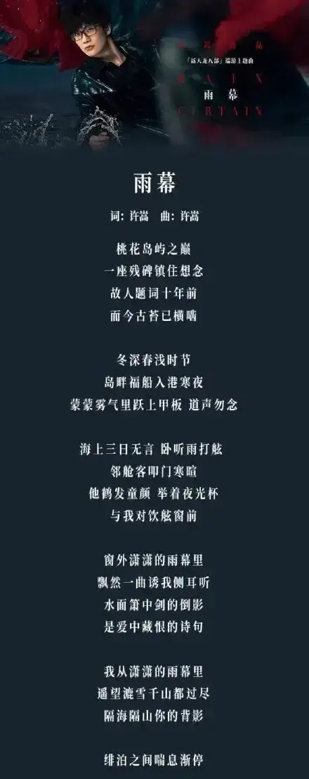 许嵩《雨幕》新歌上线啦!作为天龙八部系列的第三部曲,又是一首力作!又是一人包揽词曲制作!“窗外潇潇的雨幕里,飘然一曲诱我侧耳听。”真的太好听了!