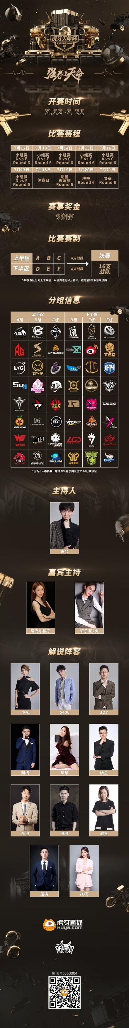 绝地求生微博杯马上就要结束了,虎牙天命杯将在7月12日与大家见面,48支战队将为了冠军荣誉和50万的赛事奖金展开厮杀。48支战队为绝地求生PCL春季赛参赛队伍,由于Tyloo战队不参赛,故邀请PDL春季赛队伍2326战队顶替。