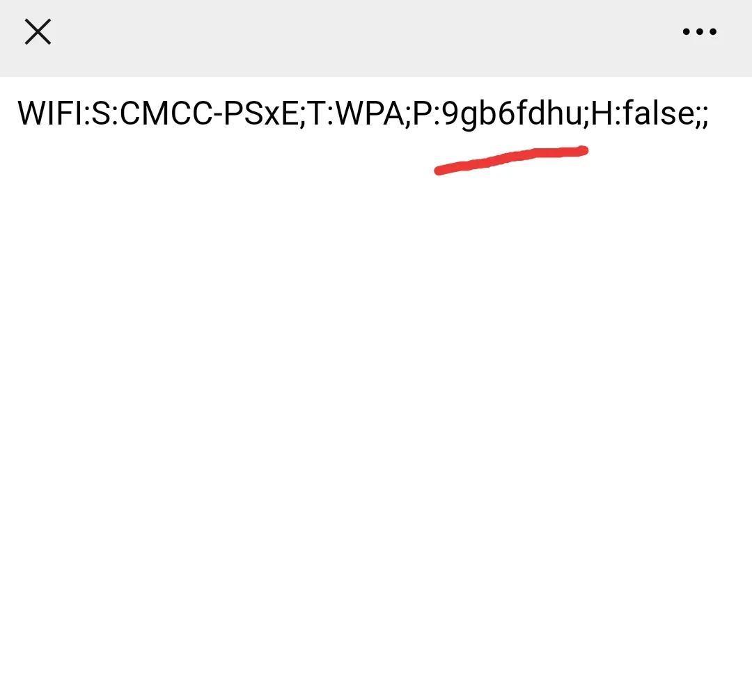 三.打开手机微信扫一扫功能,扫一下之前保存的二维码,就会出现以下一串数字,P后面的数字就是WiFi密码