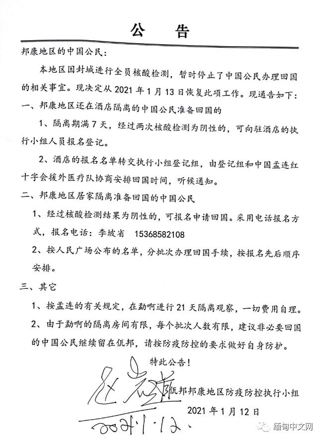 佤邦邦康地区防疫防控执行小组发布公告,从1月13日起恢复中国公民办理回国手续,符合条件的先报名登记,分批次进入勐阿口岸后需自费隔离21天。