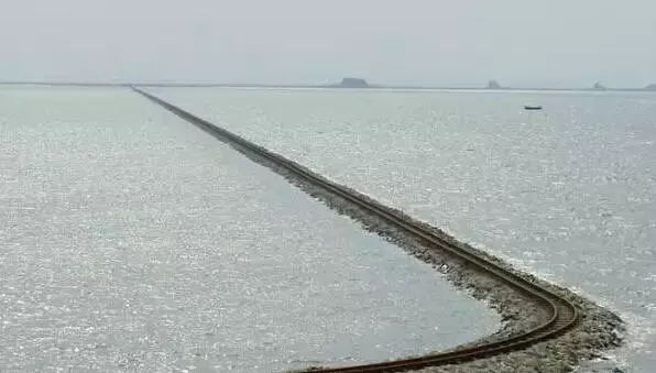 这个铁路是跨越北海与德国本土的铁路,在涨潮时就真的像在海中一样,长度大约是3公里